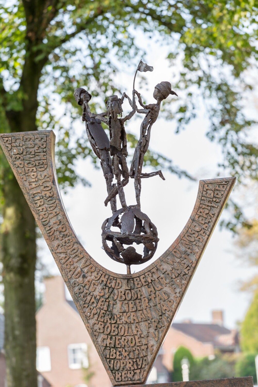 In de marmeren V staat het woord vrijheid in vele talen. Op de wereldbol smeken drie mensfiguren om diezelfde vrijheid, die voor velen in de wereld nog altijd niet vanzelfsprekend is.